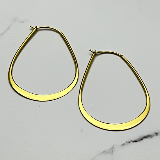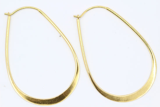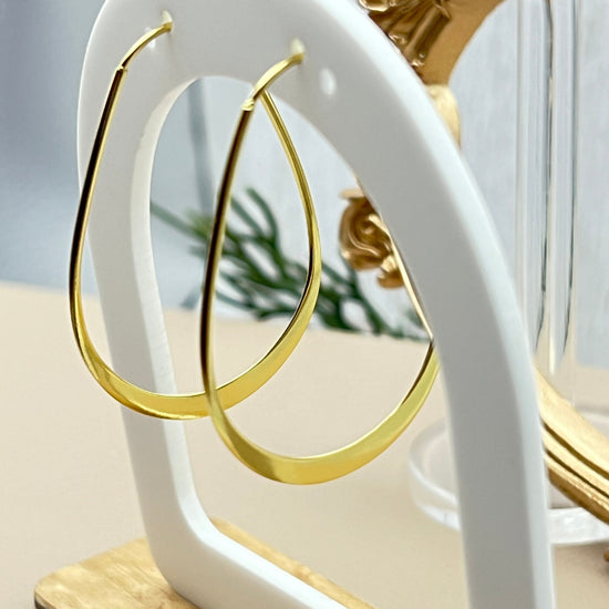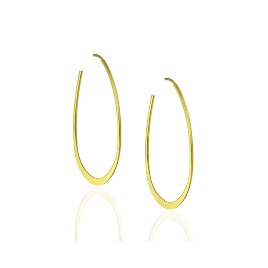 Introducing these 925 Sterling Silver Oval Hoop Earrings with luxuriant 18K yellow gold plating. These large hoop earrings accentuate the long curve of your neckline and look great with hair in an up-do or pulled back. The long oval shape moves the humble hoop away from the rounded Gypsy look to graceful elegance that can be worn day to night.