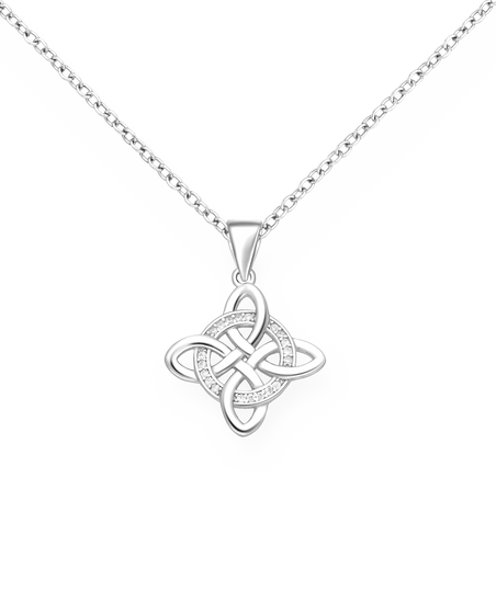 Add a touch of ancient wisdom into your jewellery with this modern Witches Knot Silver Pendant. This decorative sterling silver pendant captures a circle of cubic zirconia gemstones intertwined with gleaming silver.