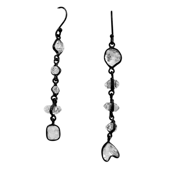 These silver earrings are the non identical twins of the earring family. They are hand crafted sterling silver earrings, with black rhodium plated silver entwined around Herkimer Diamonds. Yet, what makes them truly unique is their dissimilarities. The natural quartz Herkimer Diamond stones are different shapes and sizes, each earring is a different length, and even the hooks are sized differently. There is a wild and random beauty in their madness.