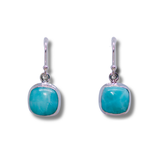 These delightful earrings contain the blue stone Larimar, from the Dominican Republic. They are hand crafted in sterling silver, and set with the lovely soft blue coloured stones which shout of hot sunny days by the shimmering blue waters of the Caribbean. Simply pair them with thongs and board shorts for the beachy vibe.