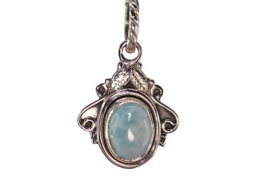 This lovely silver pendant holds a light blue Larimar stone with swirls of creamy white that bring the image of wispy clouds in a Summer sky. This pendant is perfect for dreamers and romantics being delicately handcrafted in sterling silver, it is a throw back to the age of poetry.