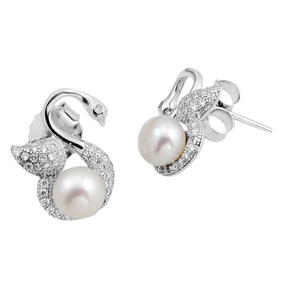 Explore our Pearl and Topaz Silver Earrings with the delightful swan design. These push-through silver earrings feature cultured pearls and are embellished with sparkling white topaz. Crafted with the finest sterling silver, they impart a sophisticated elegance making them perfect for bridesmaids or any special occasion.