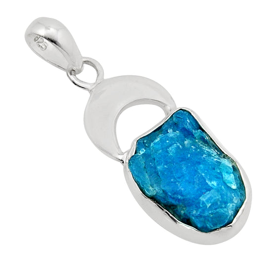 This sterling silver pendant holds a rough blue apatite stone beneath a silver moon. It is captivating with the rough stone against the smooth sheen of the silver creating design interest. The item is artisan crafted and one of a kind.