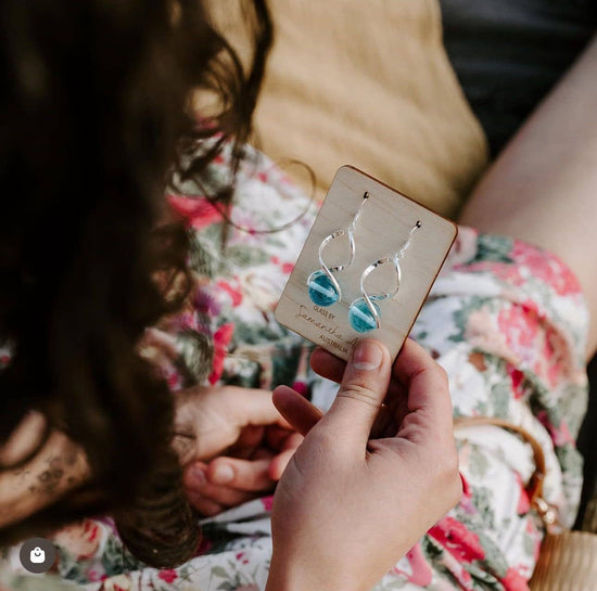 Delightful charming drop earrings, elegantly handcrafted from recycling Bombay Sapphire bottles in the flame. Exquisitely hand crafted with attention to detail from up-cycled glass, and finished with high quality 925 sterling silver findings. A vibrant and unique colour you will love. Designed and hand crafted by Glass Artist Samantha Abbott, these whimsical Blue glass Drop Earrings show case original and unique design exclusive to her range of glass.