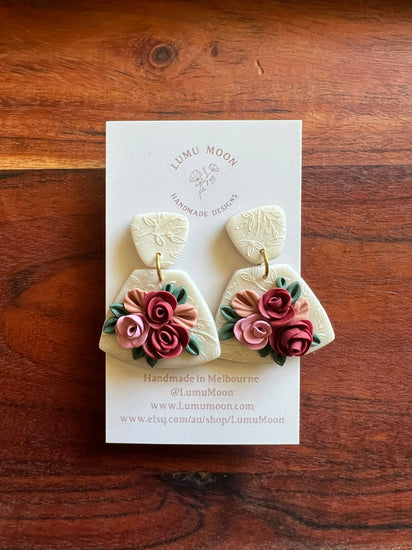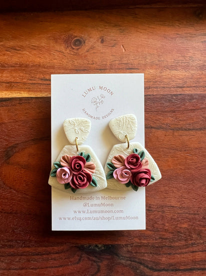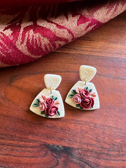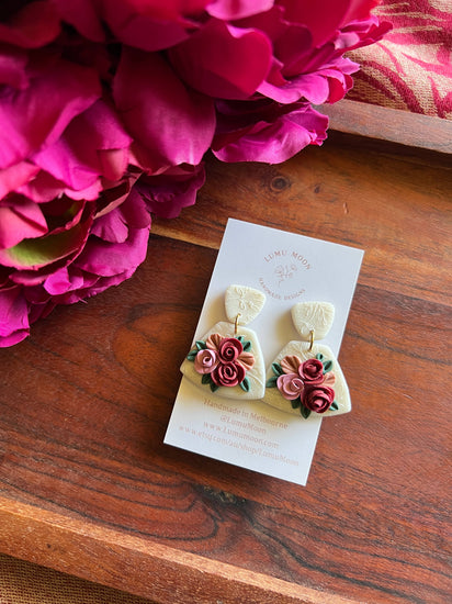 The Rose Floral Earrings were created using lightweight polymer clay Surgical steel posts have also been used making them friendly for sensitive ears Each rose has been hand sculpted to create a bouquet of flowers. The shimmery pearl white background adds a fancy touch making them a special addition to your outfit!
