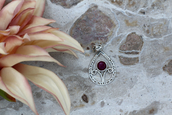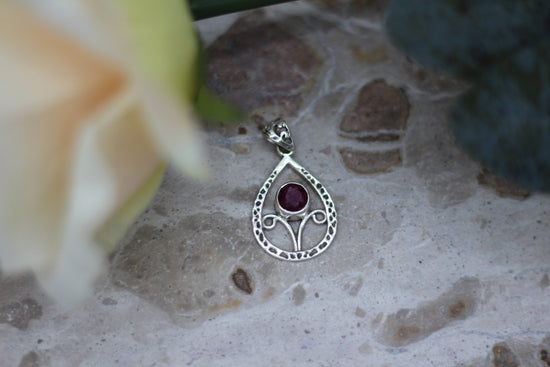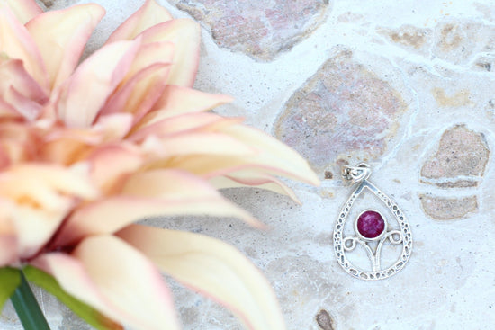 Elevate any occasion with this lovely rose ruby pendant. Perfect for adding a touch of elegance and romance to any outfit, this pendant is sure to make a statement and brighten anyone's day. Hand crafted in quality sterling silver and set with a genuine Ruby gemstone.