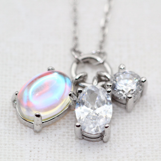 Shimmer like the twilight draped in this exquisite silver necklace featuring moonstone and cubic zirconia. Crafted from high-quality sterling silver, this necklace showcases a radiant moonstone and two cubic zirconia charms that dance on a chain at your collarbone. A perfect piece to add a touch of romance and elegance to any outfit.