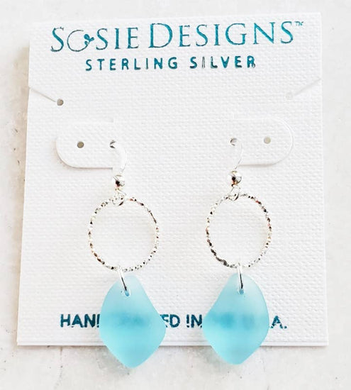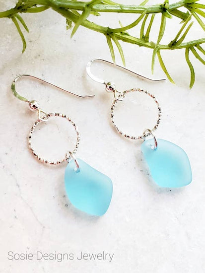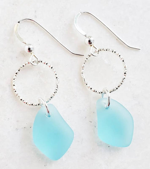 These dazzling yet elegant diamond cut sterling silver rings adorned with tumbled sea glass are perfect addition to your collections. These chic earrings are both lightweight and easy to wear for any occasions.