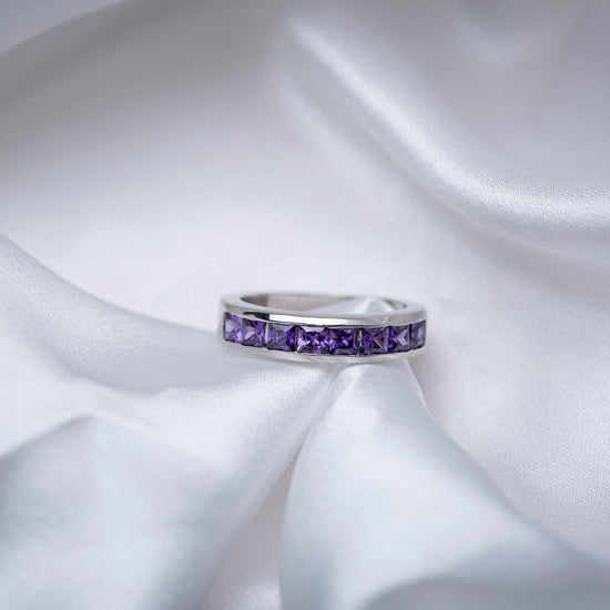 This amethyst cubic zirconia ring features a sturdy sterling silver band. The sparkling inlaid gems create a sleek, contemporary style that's both glamorous and stunning.