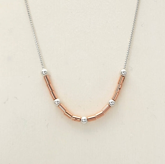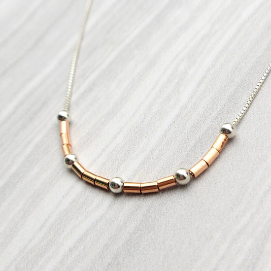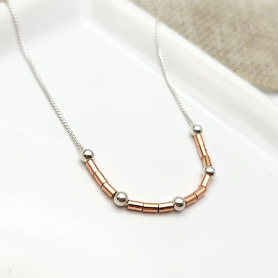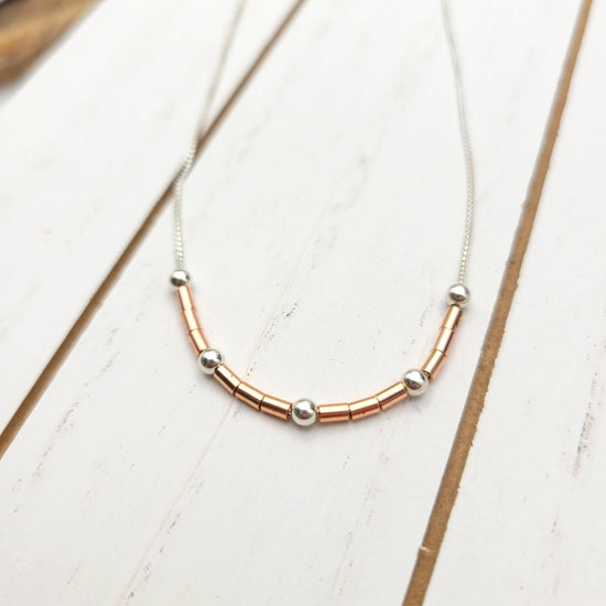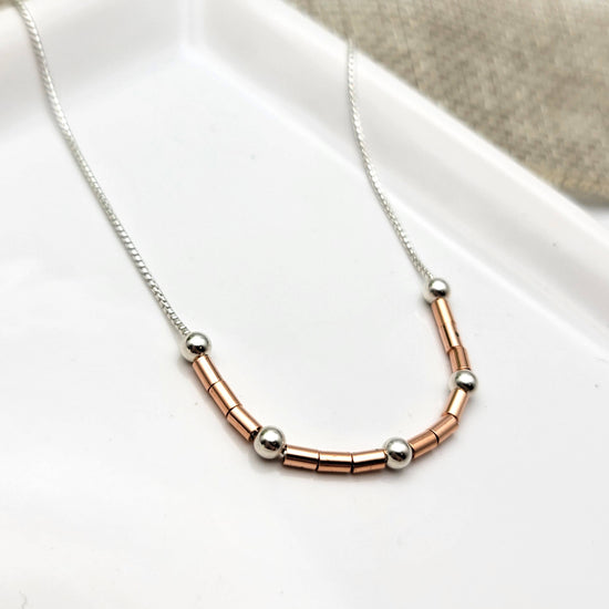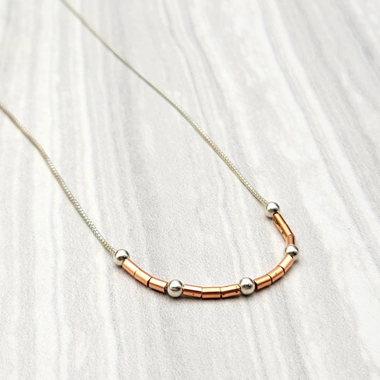 Change your vibe with pure copper and sterling silver beads set on a sterling silver box chain. Delightful easy wearing style for chilled out days.