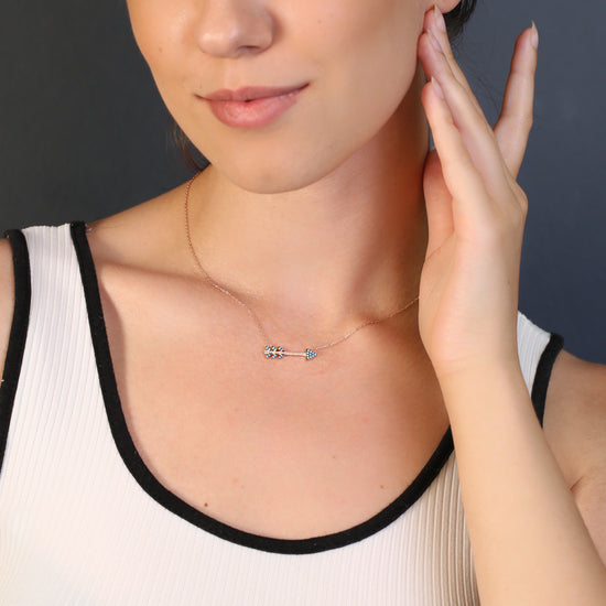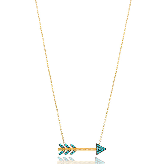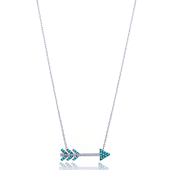 This is a quirky necklace with an arrow charm set with turquoise cubic zirconia stones. Available in either sterling silver or gold plated silver, this charming necklace is delicately hand crafted and a fun piece to wear.