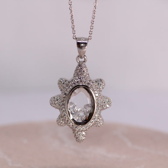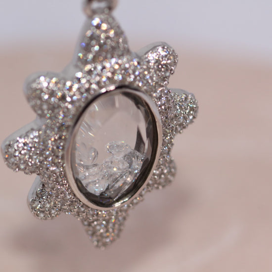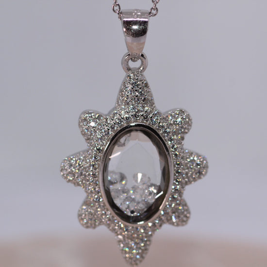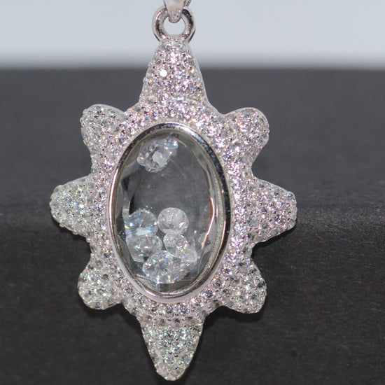 Get ready for excitement with this Topaz and Cubic Zirconia necklace. The Sterling silver necklace is hand crafted and encrusted with sparkling cubic zirconia. Besides the large size and quality finish, the necklace also contains sparkling topaz gems caught inside the centrepiece. This is a one of a kind item that you can't pass by. Set on a sterling silver chain that extends from 40-45cm you can dress up any outfit wearing this necklace. Magnifico!